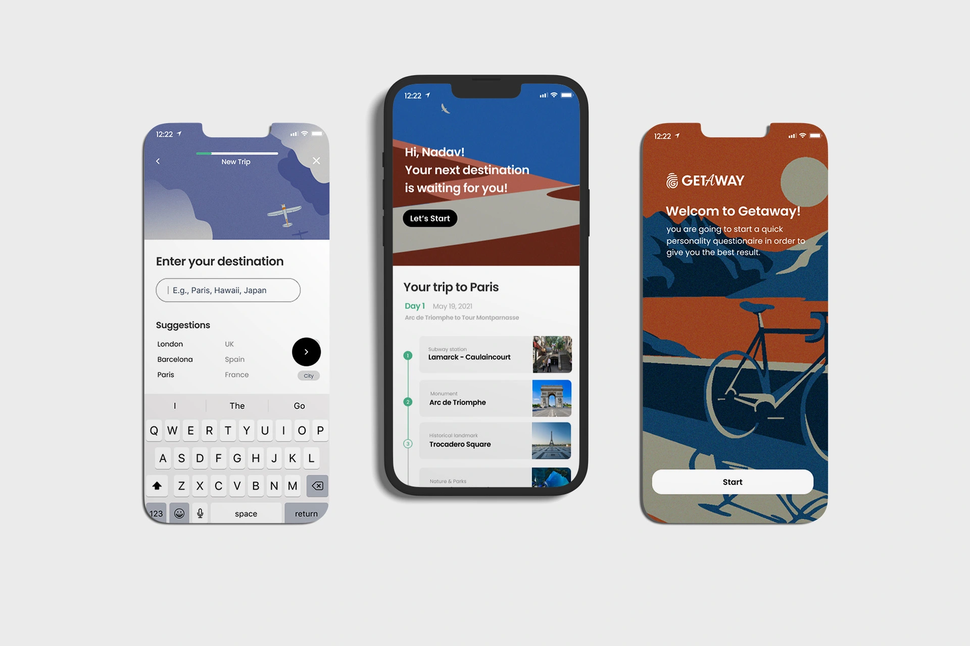 Getaway היא אפליקציה חכמה לתכנון מסלול טיול מותאם אישית, המבוססת על בינה מלאכותית. האפליקציה לומדת את המשתמש דרך שאלון אישיות ופעולות בזמן אמת, ומרכיבה עבורו את המסלול המדויק ביותר בהתאם ליעד, תקציב, תחומי עניין ומשך השהות.